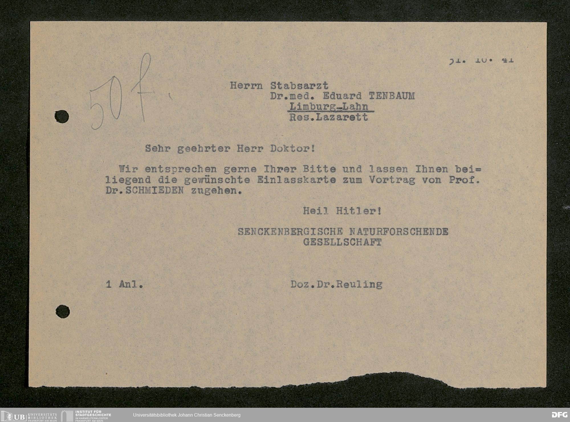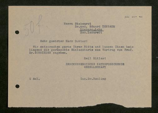 V176 Senckenberg Gesellschaft für Naturforschung, 641 - Vergabe von Freikarten zur Vorlesungen und Vorträgen der Senckenbergischen Naturforschenden Gesellschaft an Firmen, Lazarette und Schulen