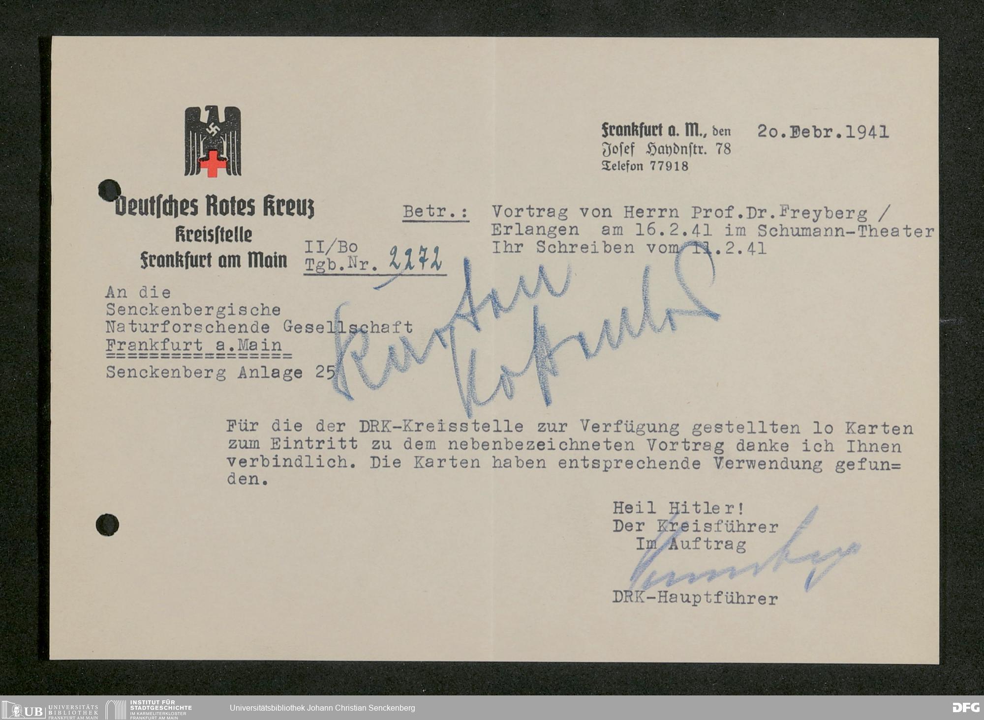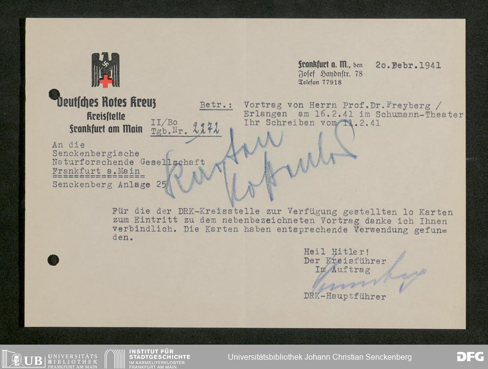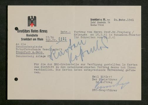 V176 Senckenberg Gesellschaft für Naturforschung, 641 - Vergabe von Freikarten zur Vorlesungen und Vorträgen der Senckenbergischen Naturforschenden Gesellschaft an Firmen, Lazarette und Schulen