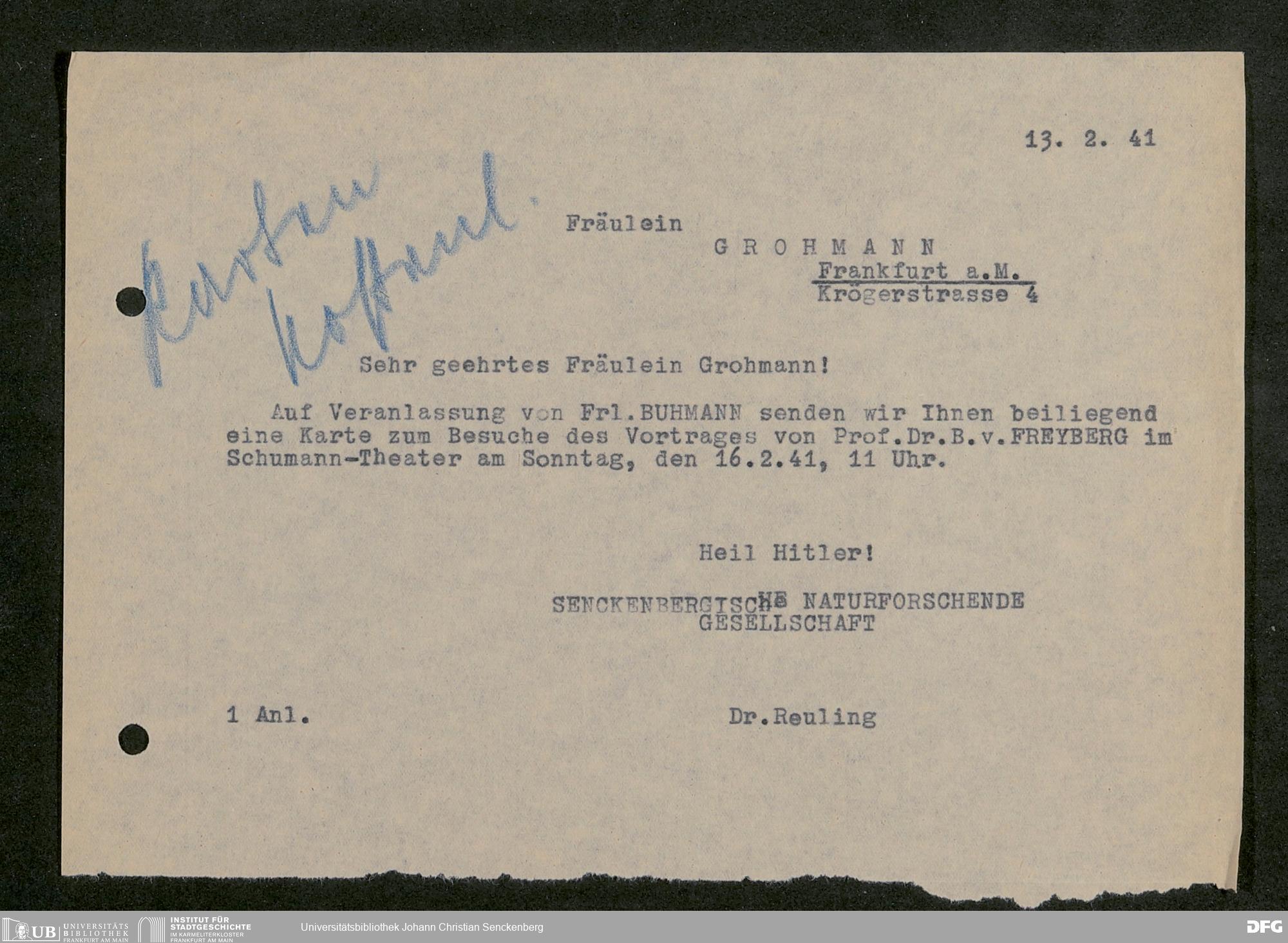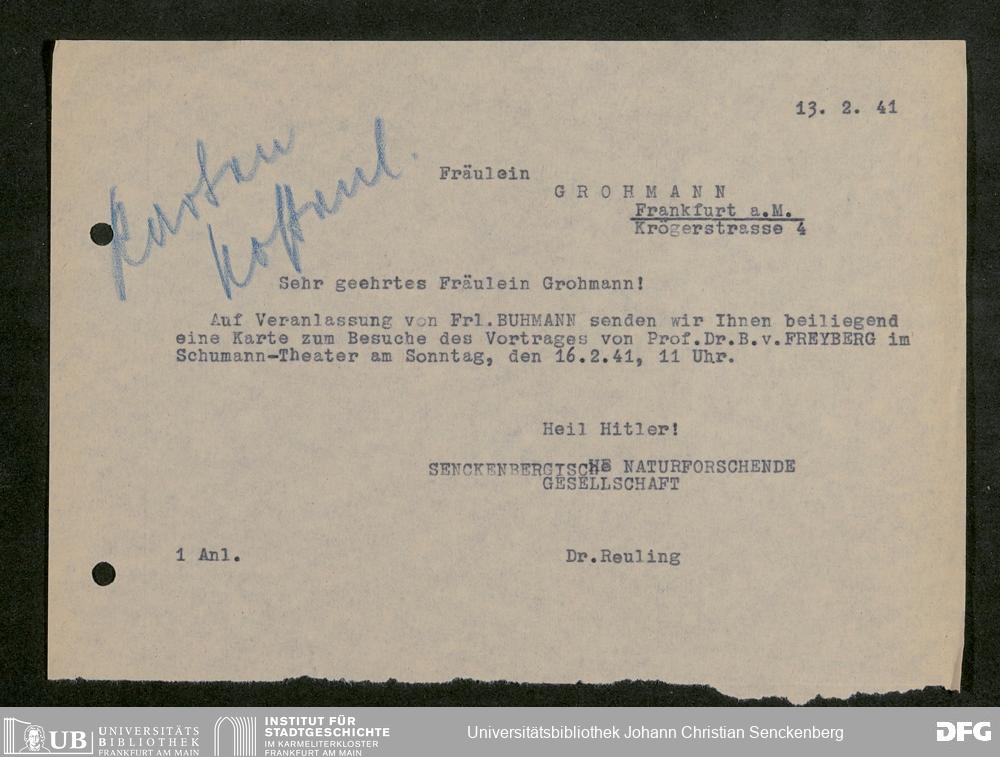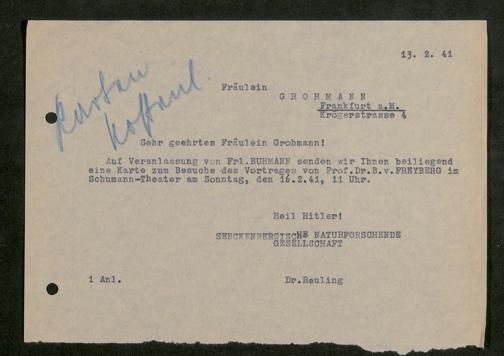 V176 Senckenberg Gesellschaft für Naturforschung, 641 - Vergabe von Freikarten zur Vorlesungen und Vorträgen der Senckenbergischen Naturforschenden Gesellschaft an Firmen, Lazarette und Schulen