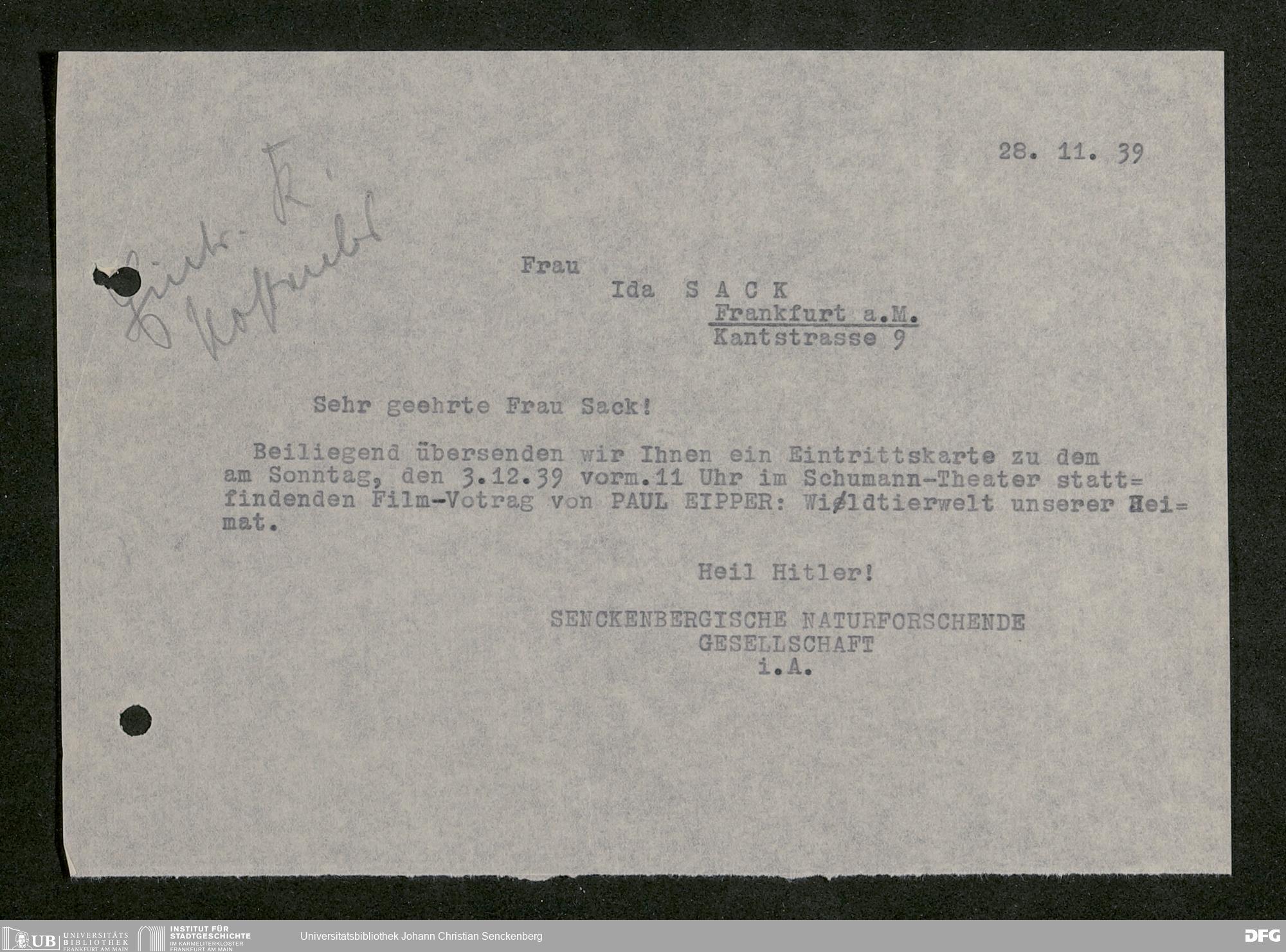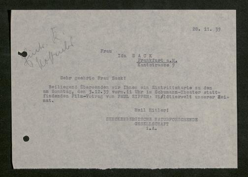 V176 Senckenberg Gesellschaft für Naturforschung, 641 - Vergabe von Freikarten zur Vorlesungen und Vorträgen der Senckenbergischen Naturforschenden Gesellschaft an Firmen, Lazarette und Schulen