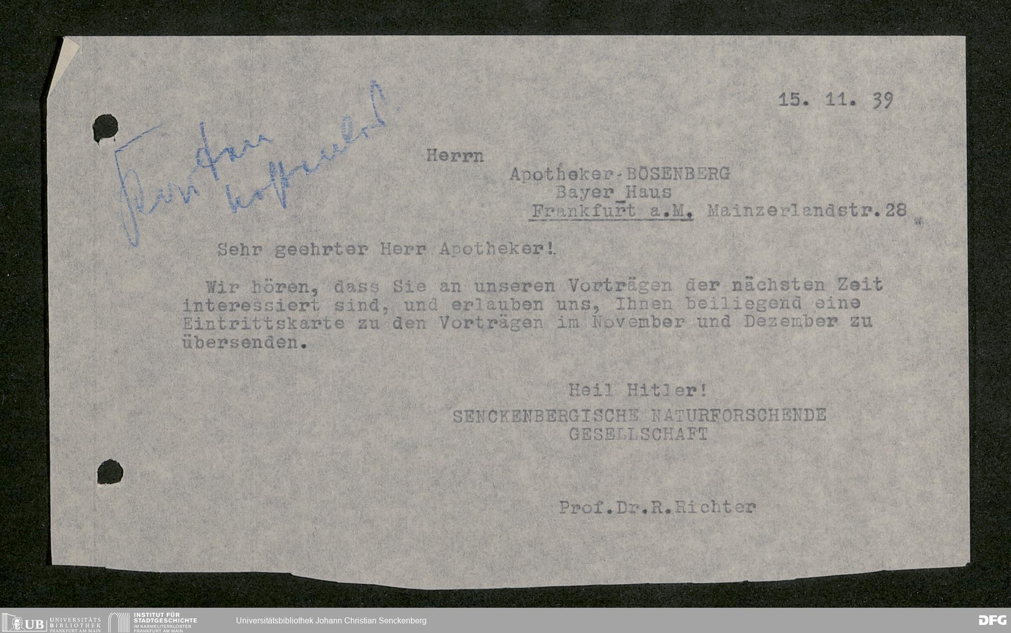 V176 Senckenberg Gesellschaft für Naturforschung, 641 - Vergabe von Freikarten zur Vorlesungen und Vorträgen der Senckenbergischen Naturforschenden Gesellschaft an Firmen, Lazarette und Schulen