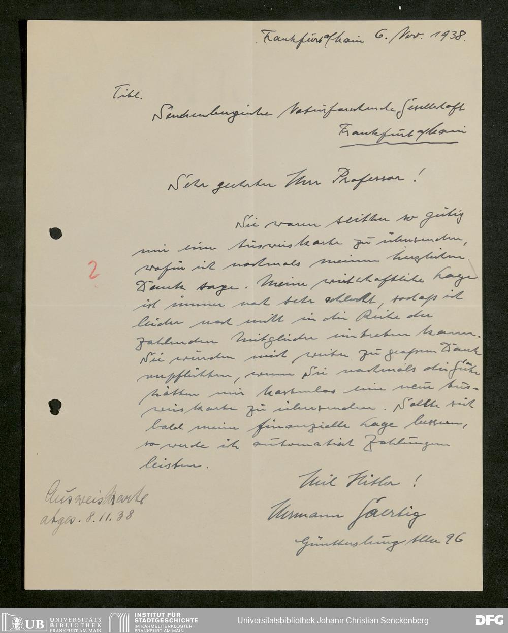 V176 Senckenberg Gesellschaft für Naturforschung, 641 - Vergabe von Freikarten zur Vorlesungen und Vorträgen der Senckenbergischen Naturforschenden Gesellschaft an Firmen, Lazarette und Schulen