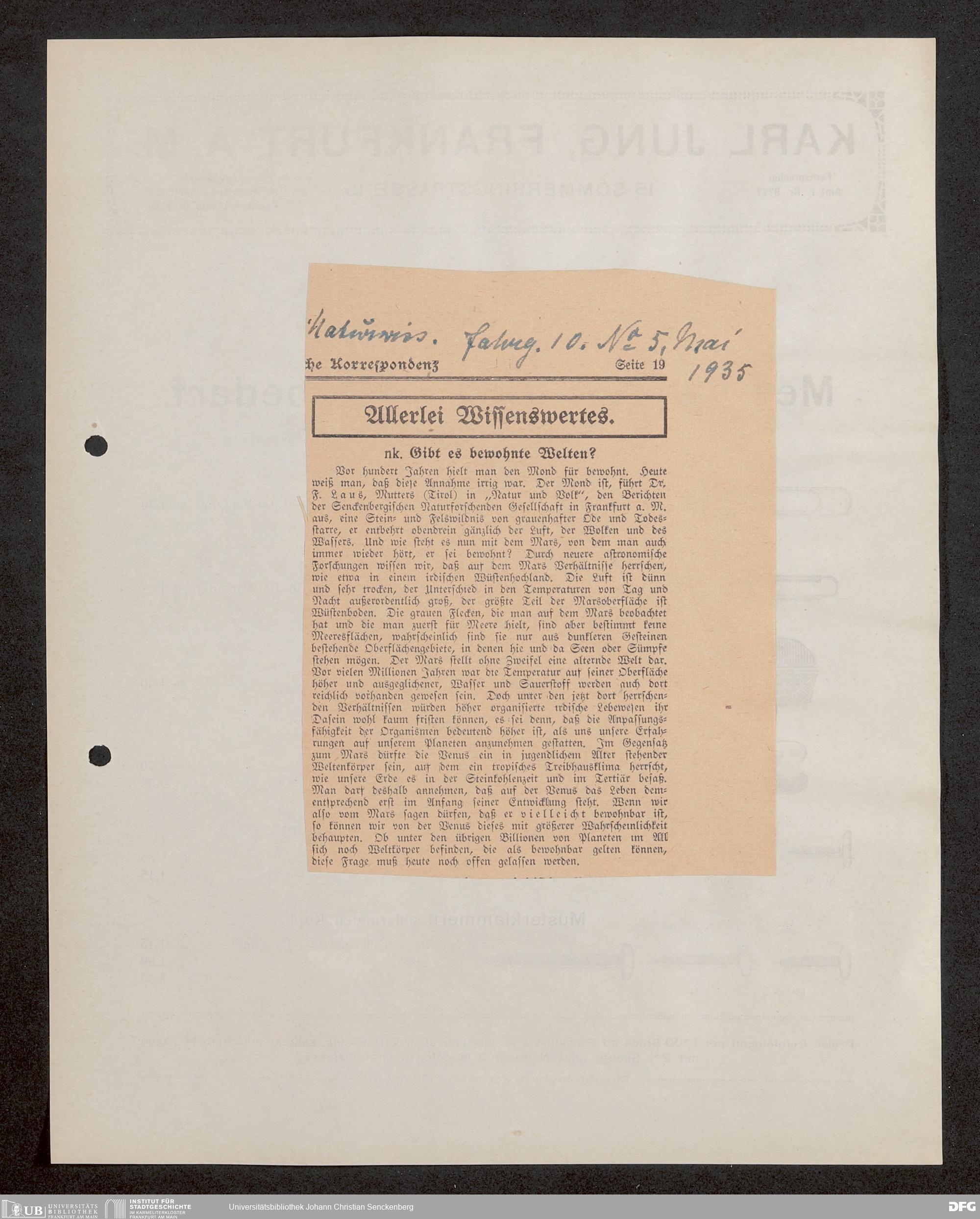 V176 Senckenberg Gesellschaft für Naturforschung, 647 - Rezensionen zu "Natur und Museum" bzw. "Natur und Volk"