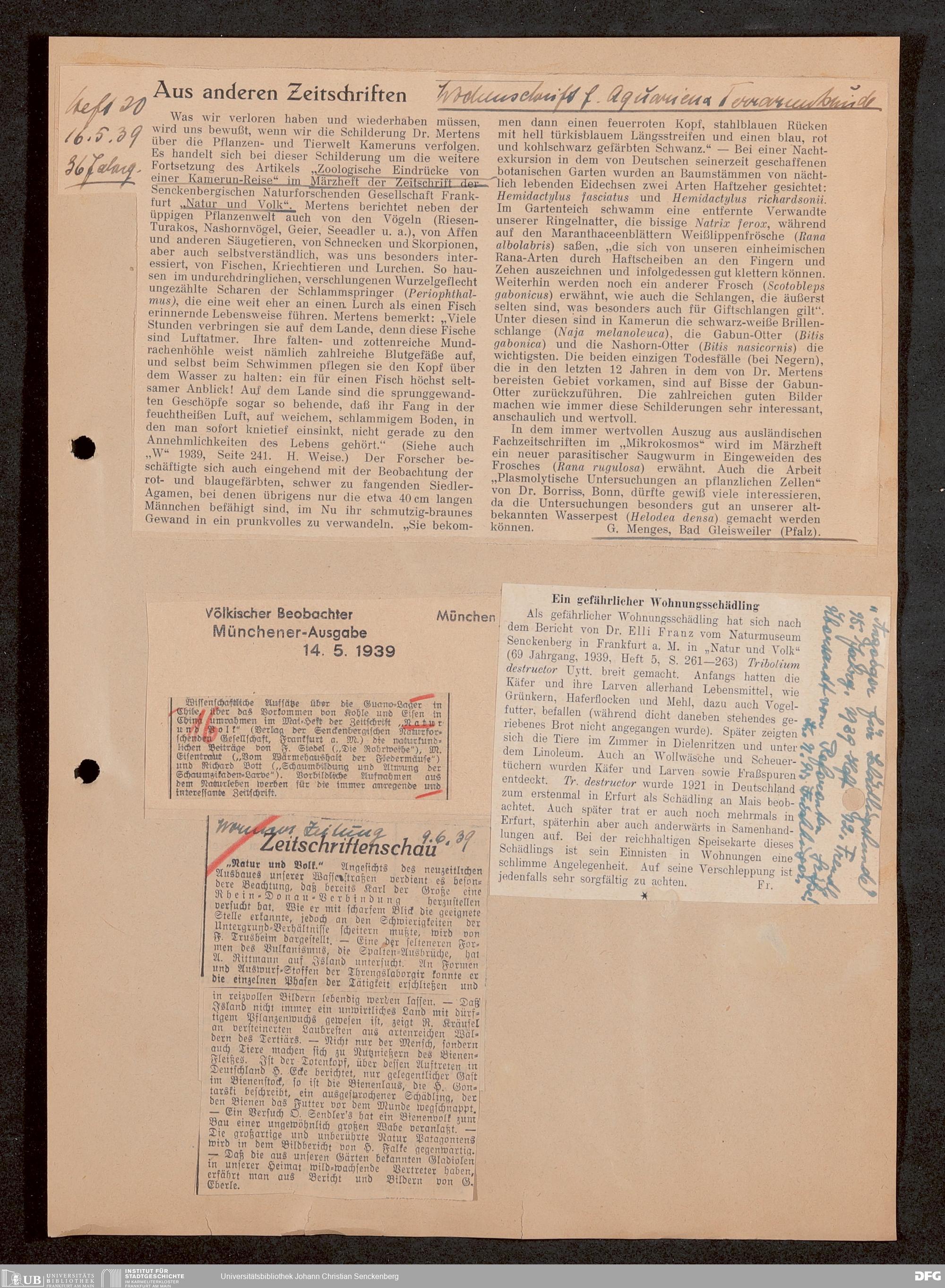 V176 Senckenberg Gesellschaft für Naturforschung, 647 - Rezensionen zu "Natur und Museum" bzw. "Natur und Volk"