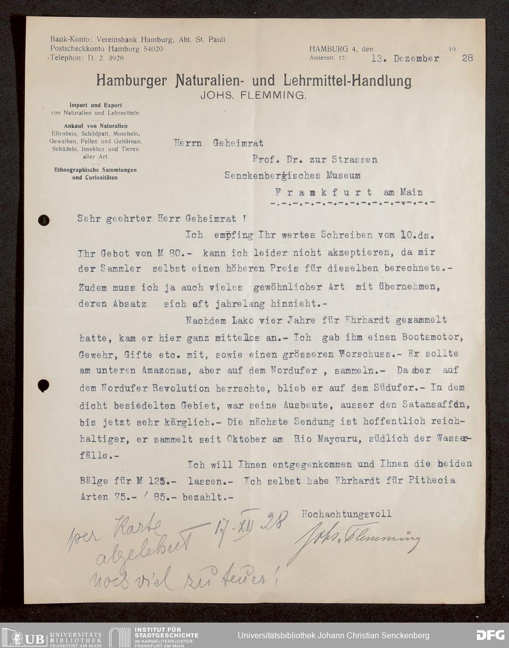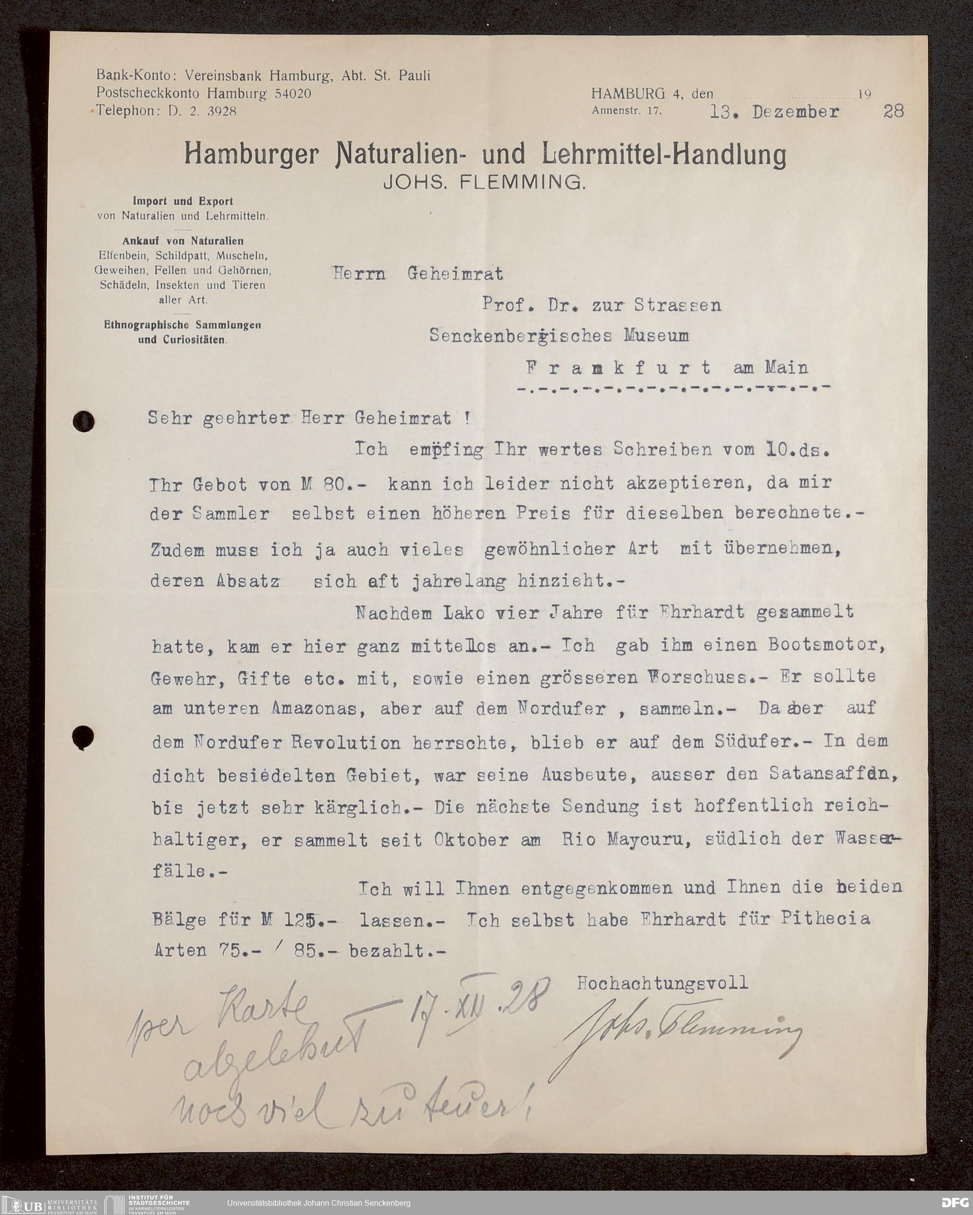 V176 Senckenberg Gesellschaft für Naturforschung, 1730 - Korrespondenz der Museumsleitung über Ankauf und Tausch von mammalogischen Exponaten