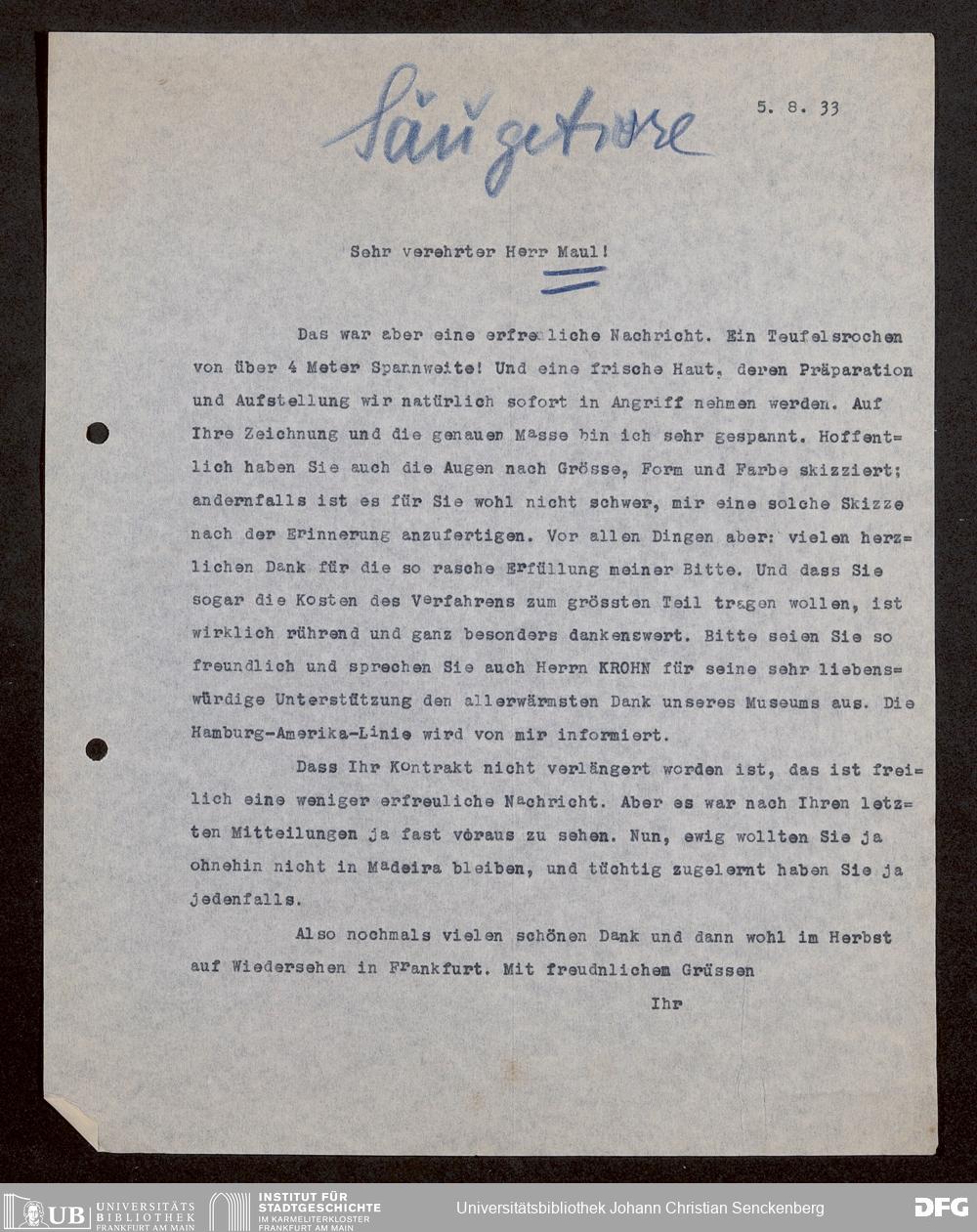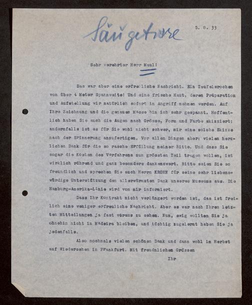 V176 Senckenberg Gesellschaft für Naturforschung, 1730 - Korrespondenz der Museumsleitung über Ankauf und Tausch von mammalogischen Exponaten