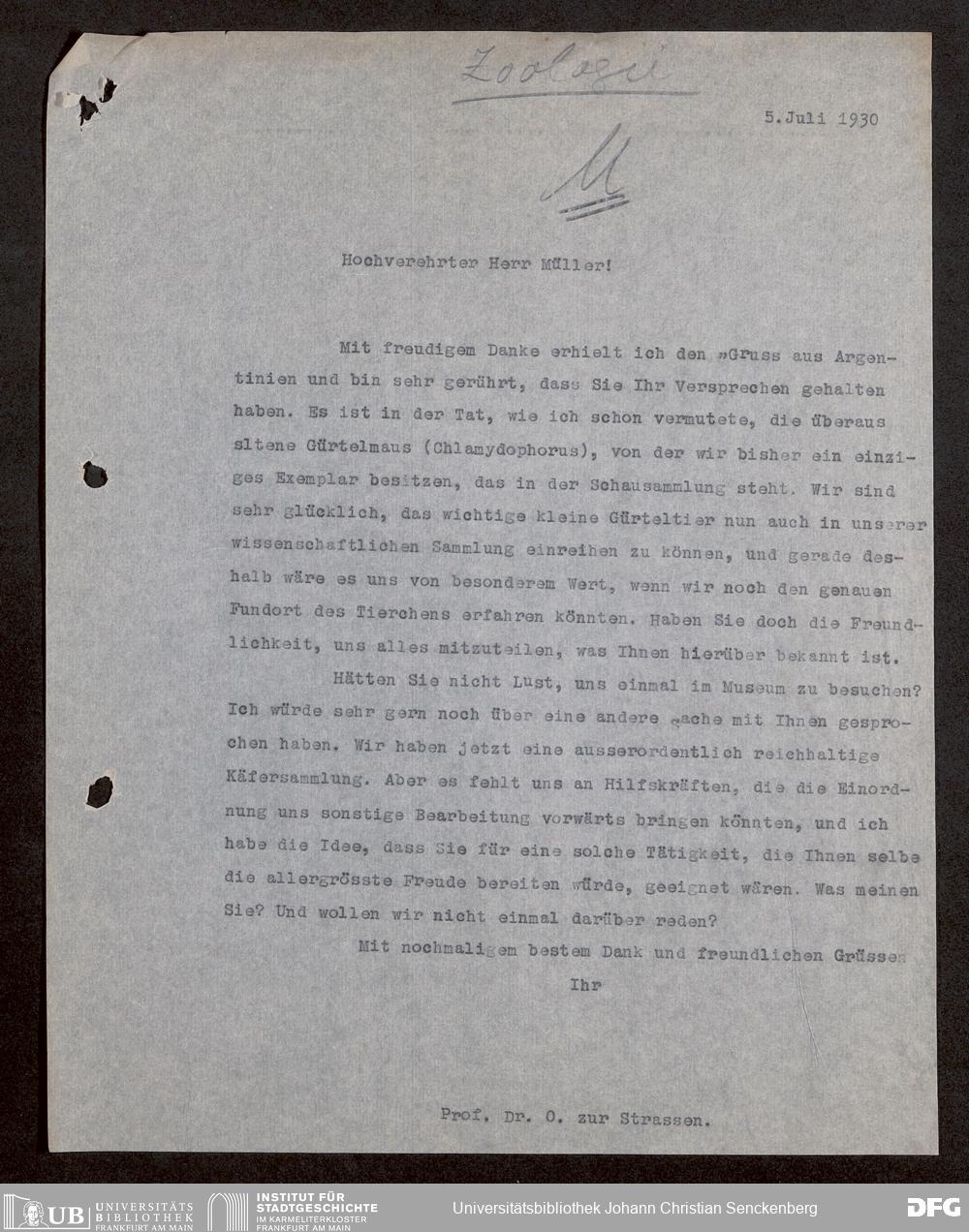 V176 Senckenberg Gesellschaft für Naturforschung, 1730 - Korrespondenz der Museumsleitung über Ankauf und Tausch von mammalogischen Exponaten