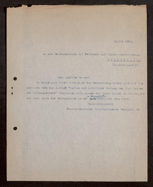 V176 Senckenberg Gesellschaft für Naturforschung, 1730 - Korrespondenz der Museumsleitung über Ankauf und Tausch von mammalogischen Exponaten
