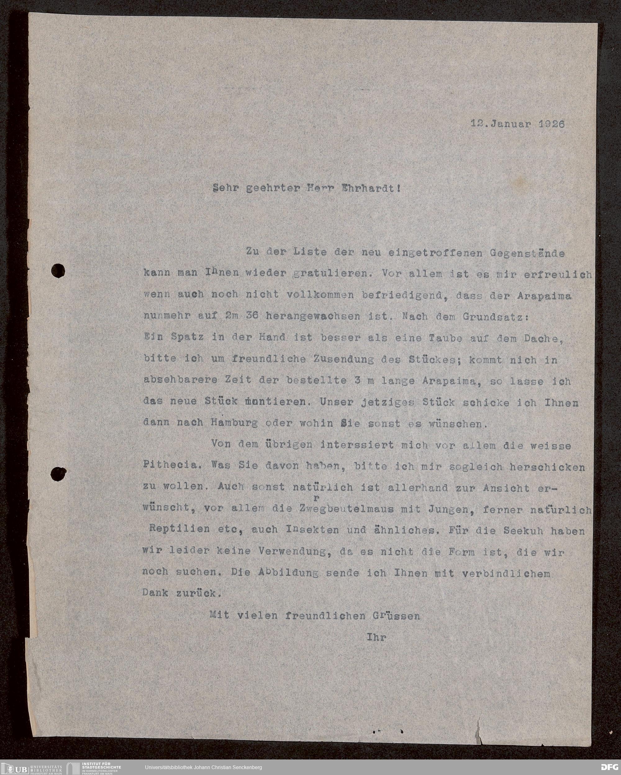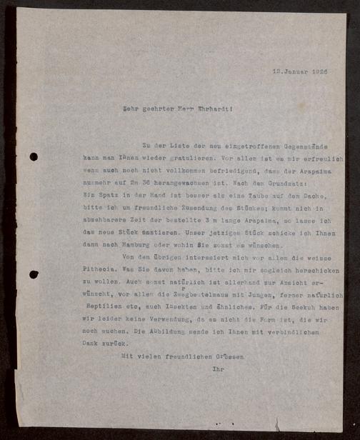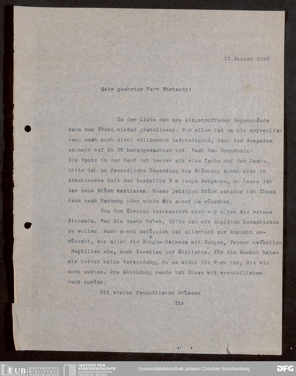 V176 Senckenberg Gesellschaft für Naturforschung, 1730 - Korrespondenz der Museumsleitung über Ankauf und Tausch von mammalogischen Exponaten