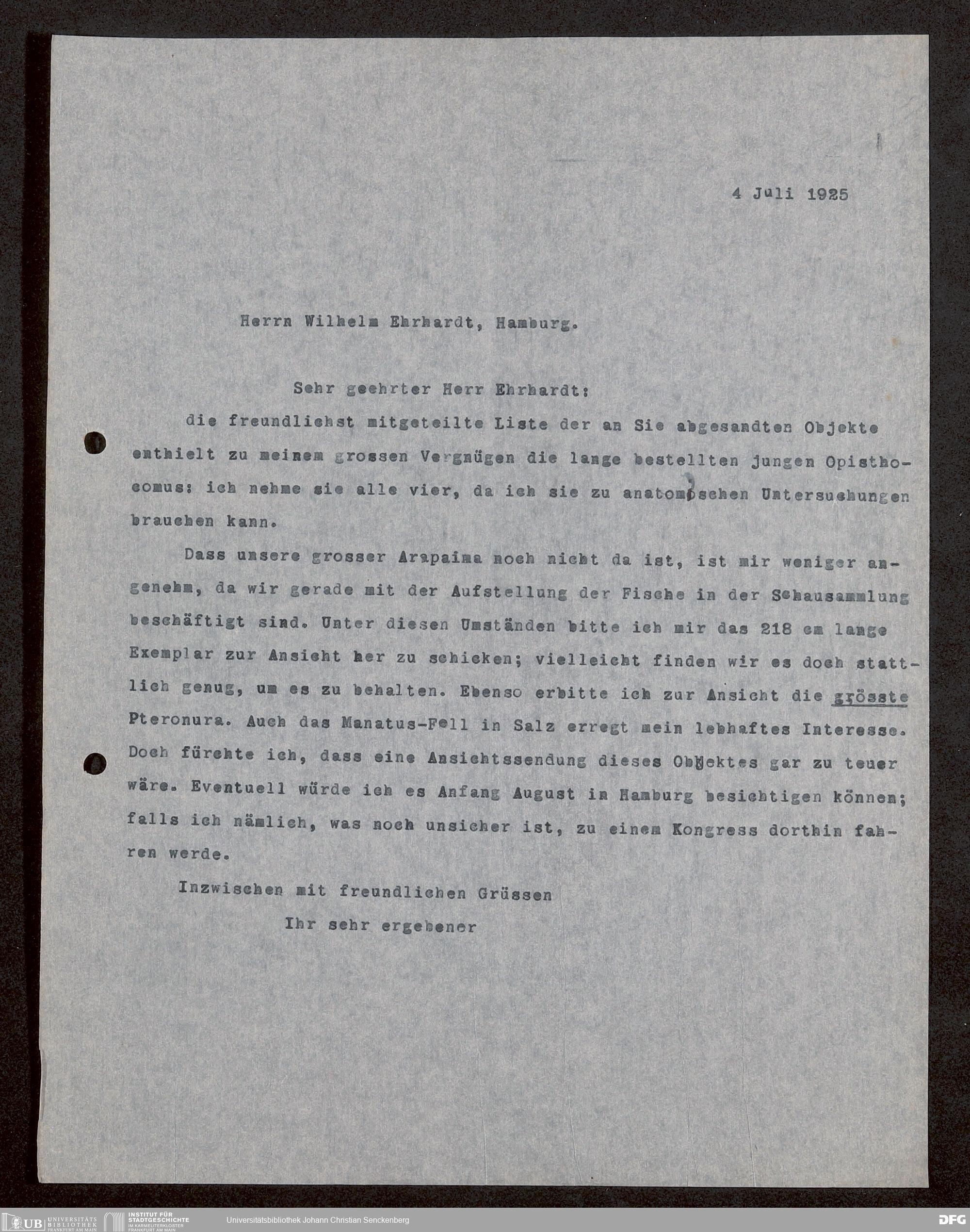 V176 Senckenberg Gesellschaft für Naturforschung, 1730 - Korrespondenz der Museumsleitung über Ankauf und Tausch von mammalogischen Exponaten