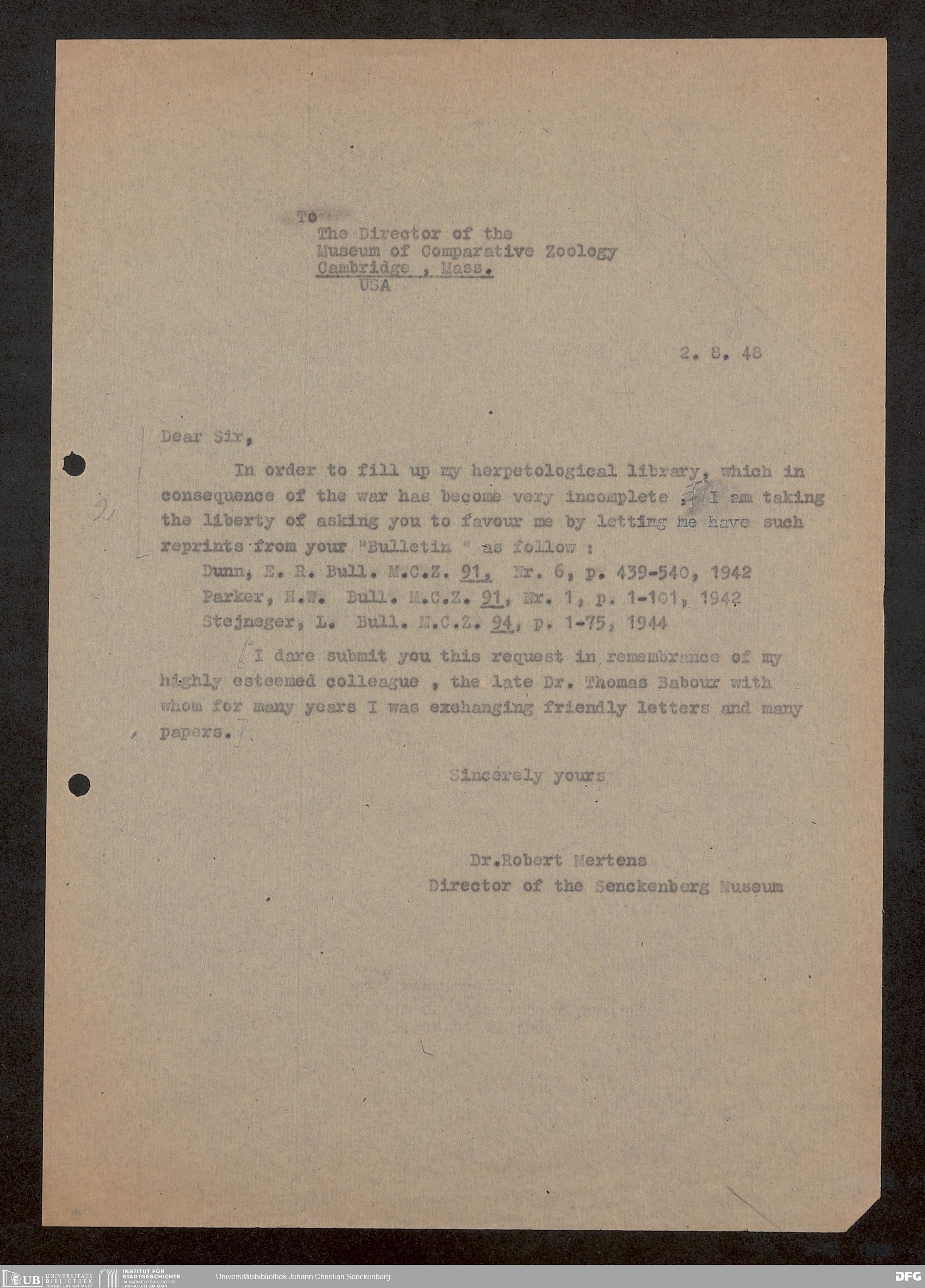 V176 Senckenberg Gesellschaft für Naturforschung, 1759-1 - Korrespondenz von Robert Mertens