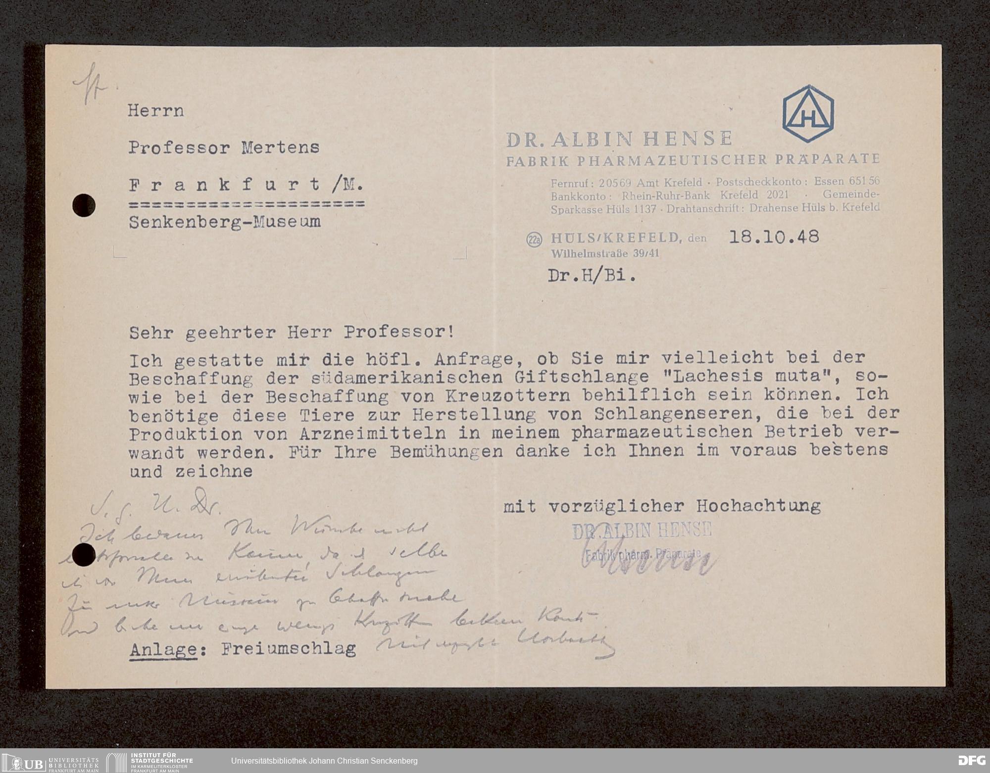 V176 Senckenberg Gesellschaft für Naturforschung, 1759-1 - Korrespondenz von Robert Mertens