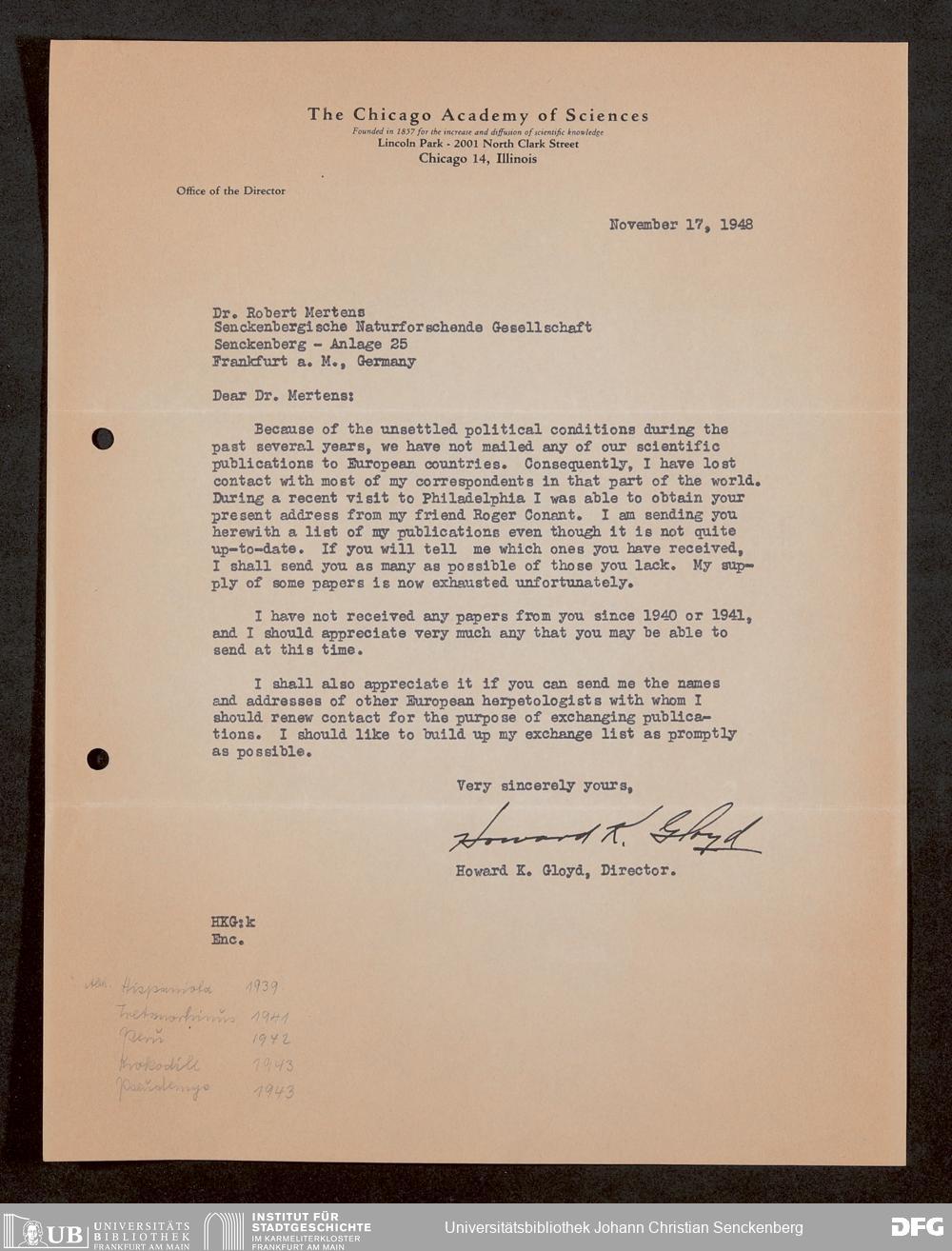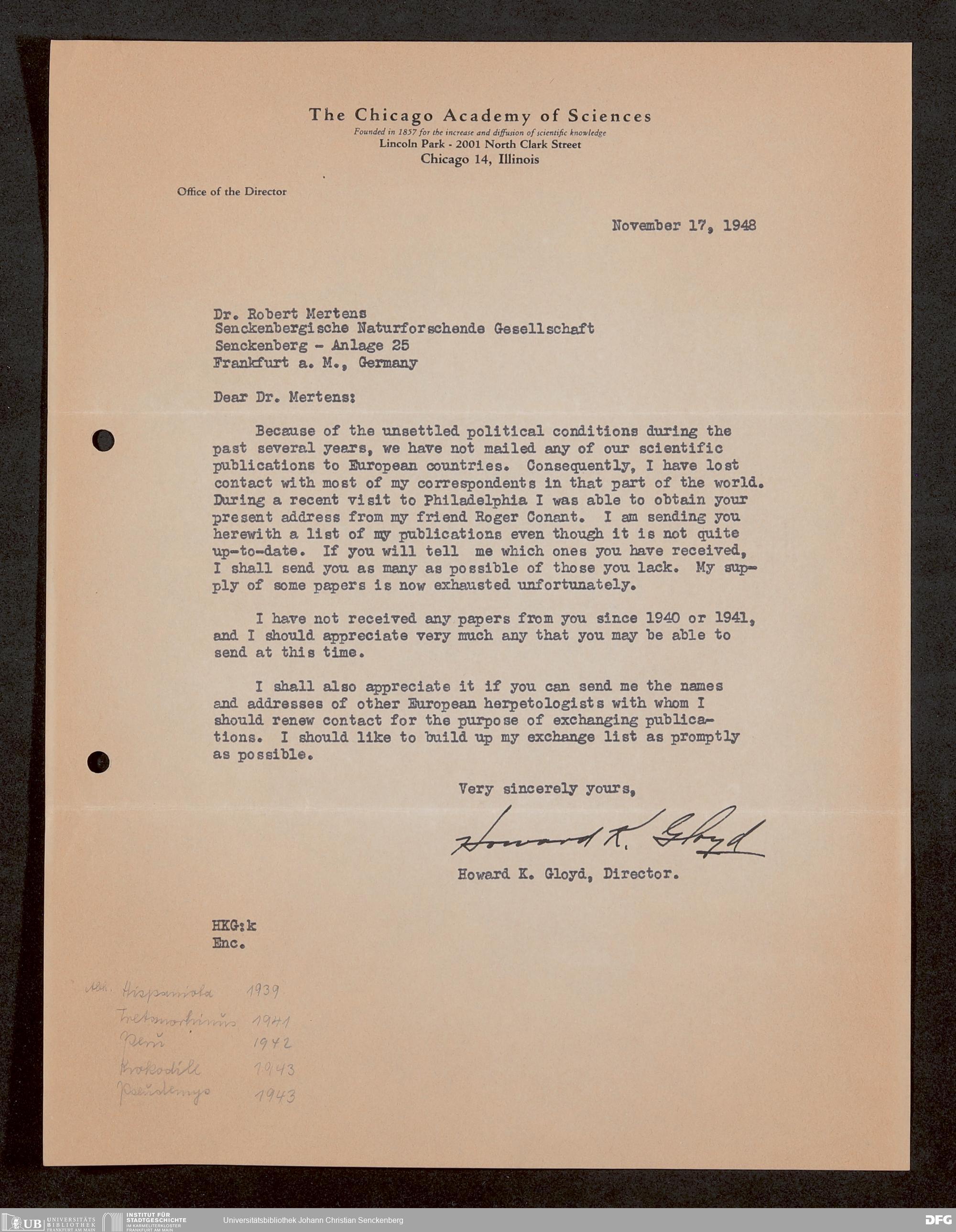 V176 Senckenberg Gesellschaft für Naturforschung, 1759-1 - Korrespondenz von Robert Mertens