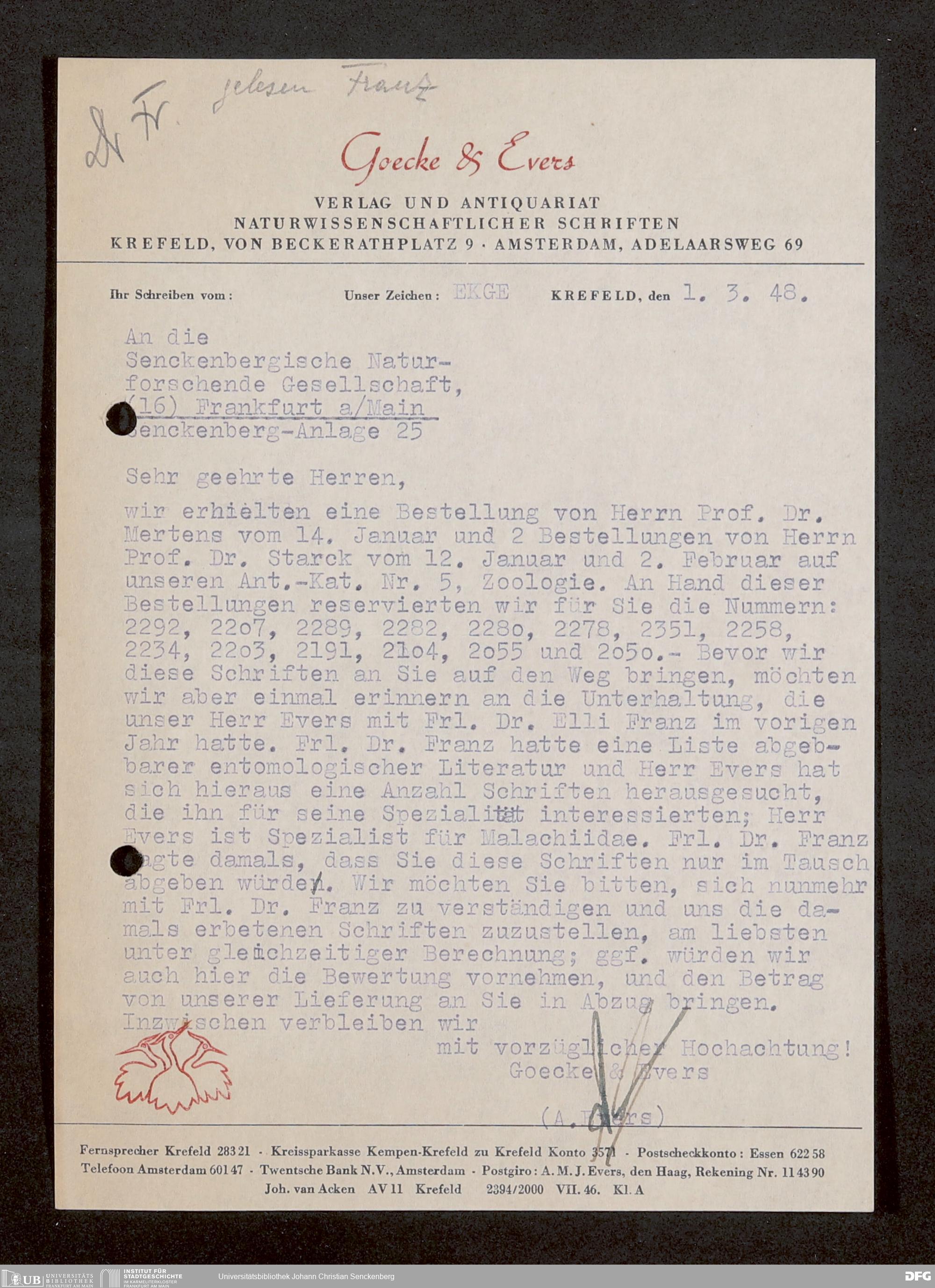 V176 Senckenberg Gesellschaft für Naturforschung, 1759-1 - Korrespondenz von Robert Mertens