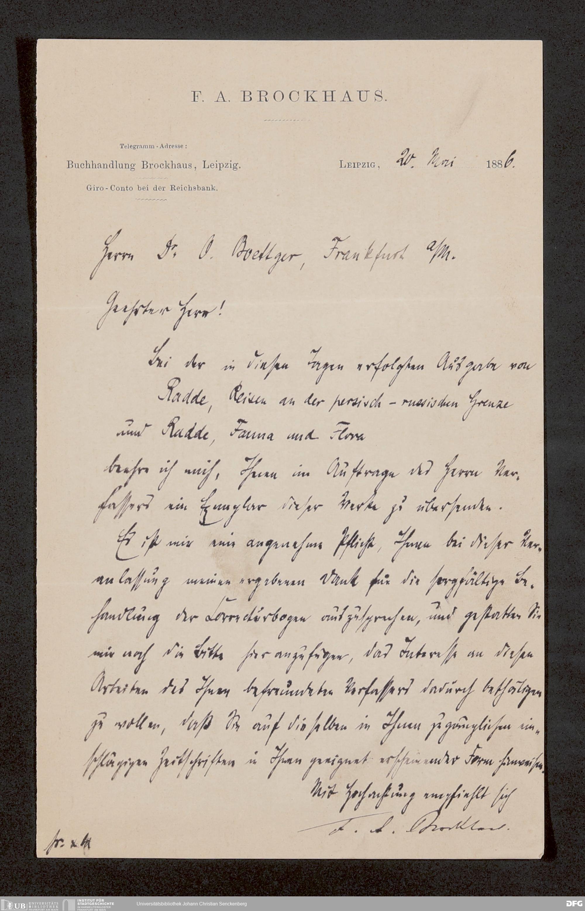 V176 Senckenberg Gesellschaft für Naturforschung, 1763 - Brief des Verlegers Eduard Brockhaus an den Herpetologen Otto Boettger mit der Bitte um die Bewerbung von Neuerscheinungen